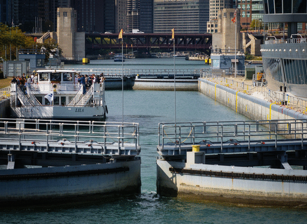 The Harbor Lock, located just south of Navy Pier, functions like a water elevator, allowing vessels to travel between the difference in elevations between the river and the lake.